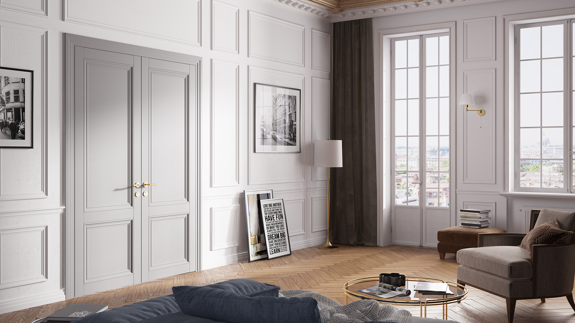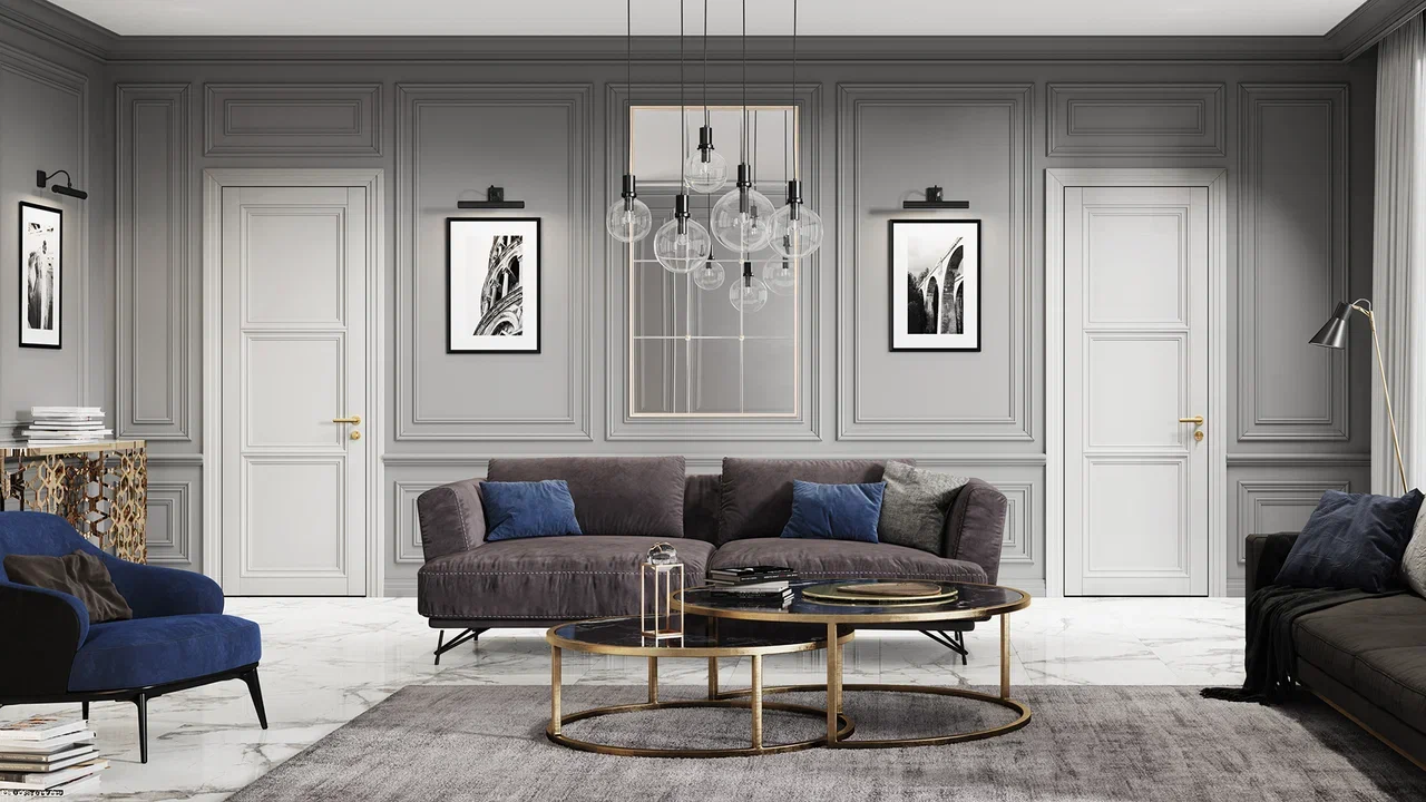 Centro — неоклассические двери с багетной рамкой на полотне будут смотреться одинаково эффектно и в классическом и в современном интерьере. Дополняют образ коллекции каскадный наличник и плинтус.