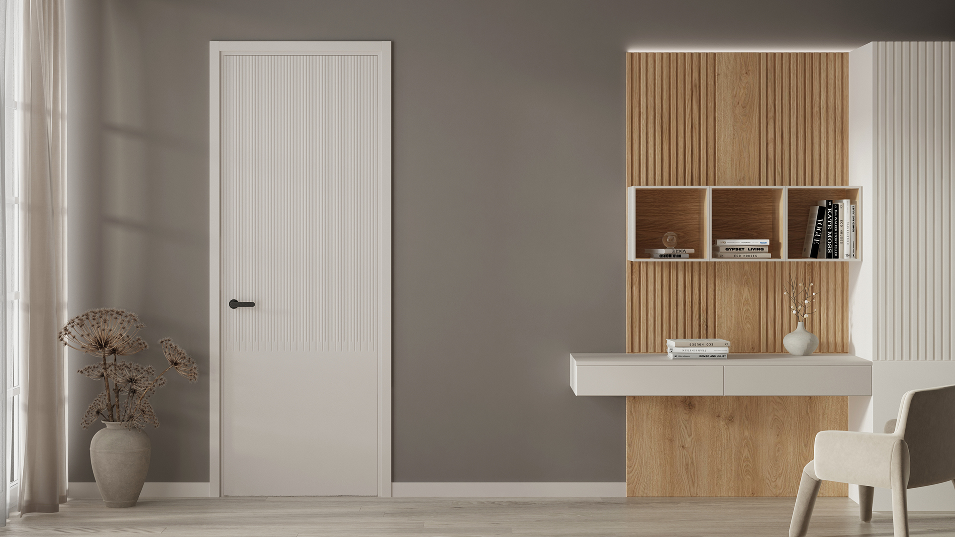 Dune — коллекция дверей украшена частой прямой фрезеровкой, которая напоминает волны дюн в пустыне. Созданная на поверхности полотна текстура привлекает взгляд и добавляет глубину пространству. Двери Dune — это сочетание современного дизайна и вдохновения живописными природными ландшафтами.