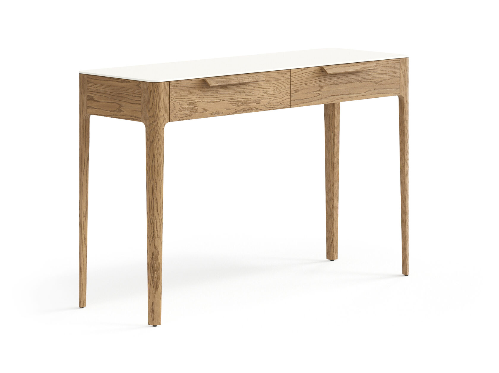 Консоль с двумя выдвижными ящиками на высоких элегантных опорах идеально впишется в любое помещение вашего дома и сделает его особенным. Изысканно сглаженные формы подчёркивают теплоту дерева, наполняют пространство природной гармонией. Скрытые направляющие ящиков с доводчиками и ручки в форме крыла делают пользование консолью мягким, уверенным и максимально комфортным. Столешница выполнена из керамогранита, крепкая поверхность приятна на вид и на ощупь. Ваза с букетом свежих цветов, любимые сборники литературы и тёплый торшер на консоли создадут истинный уют.